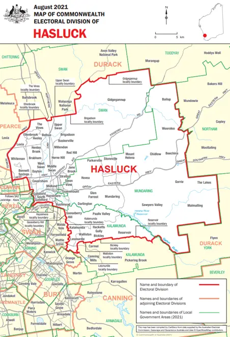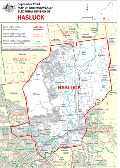 In 2024, the AEC announced Hasluck would undergo significant changes to its boundaries following the introduction of a new seat in Perth’s East. This meant Hasluck lost the Perth Hills and shifted westward to include the major suburbs of Beechboro, Noranda, and Bassendean.